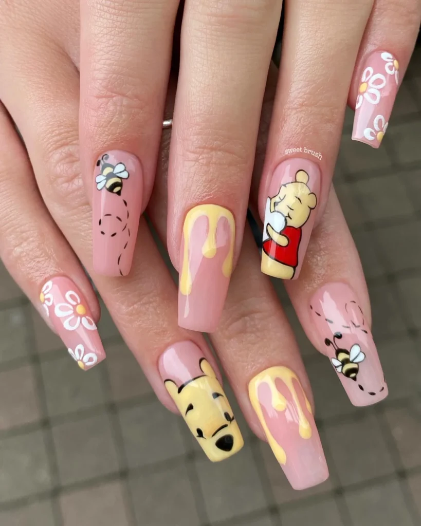 #3. Winnie the Pooh and Floral Nail Design with Honey Drips