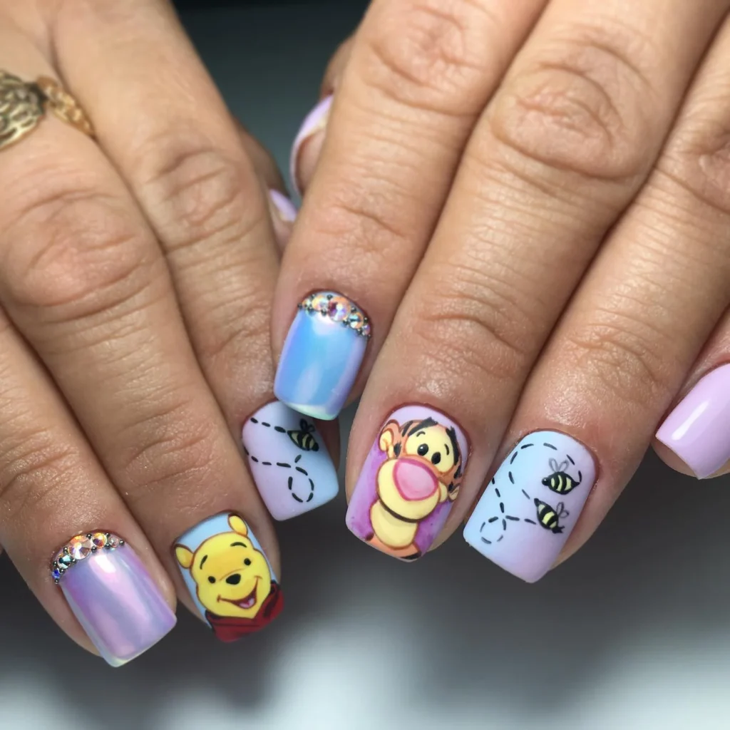 This fun and vibrant nail art showcases beloved Winnie the Pooh characters, including Pooh, Piglet, Tigger, and Eeyore, along with playful bees and butterflies. The soft pastel colors complete the whimsical design.