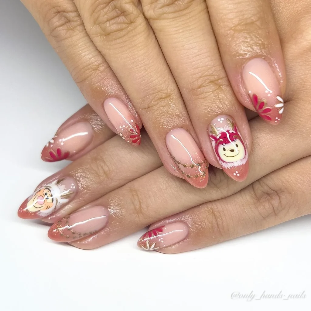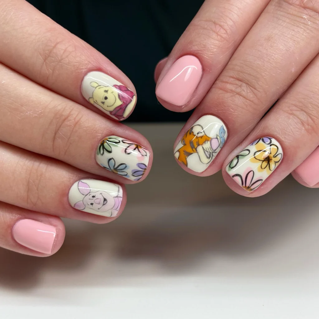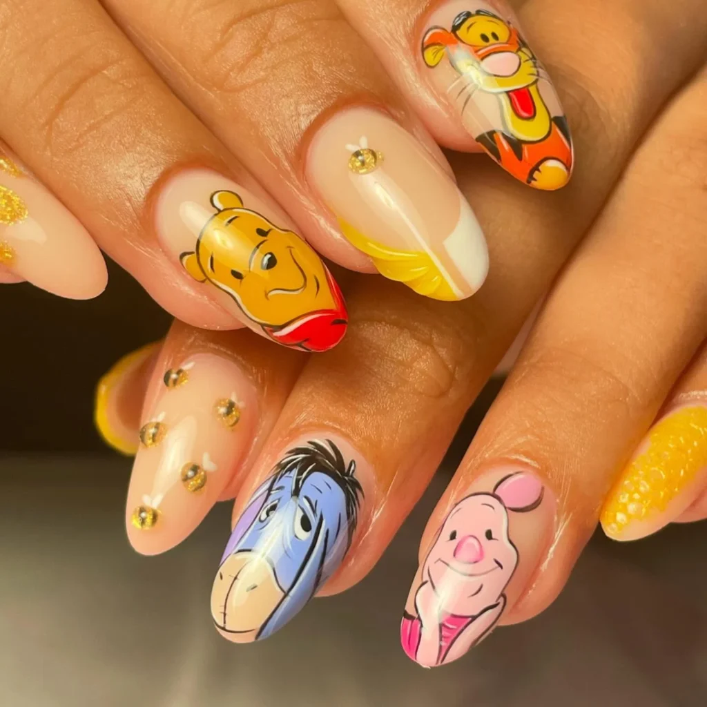Inspired by the beloved Disney classic, these nails feature adorable characters like Pooh, Tigger, Piglet, and Eeyore, along with playful honey drips and soft pastel hues.