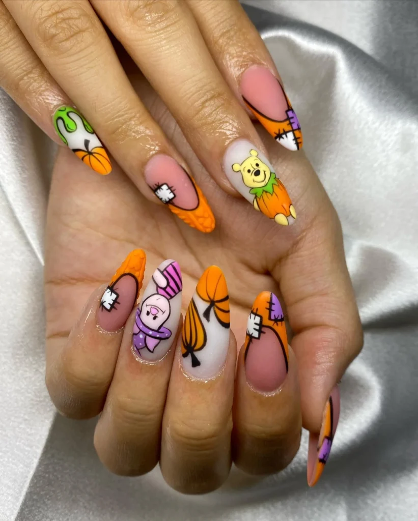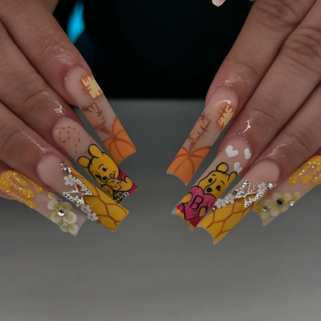 This vibrant nail design brings Winnie the Pooh to life with intricate details like honey drips, flowers, and cartoonish elements, capturing the beloved character’s playful and sweet nature.