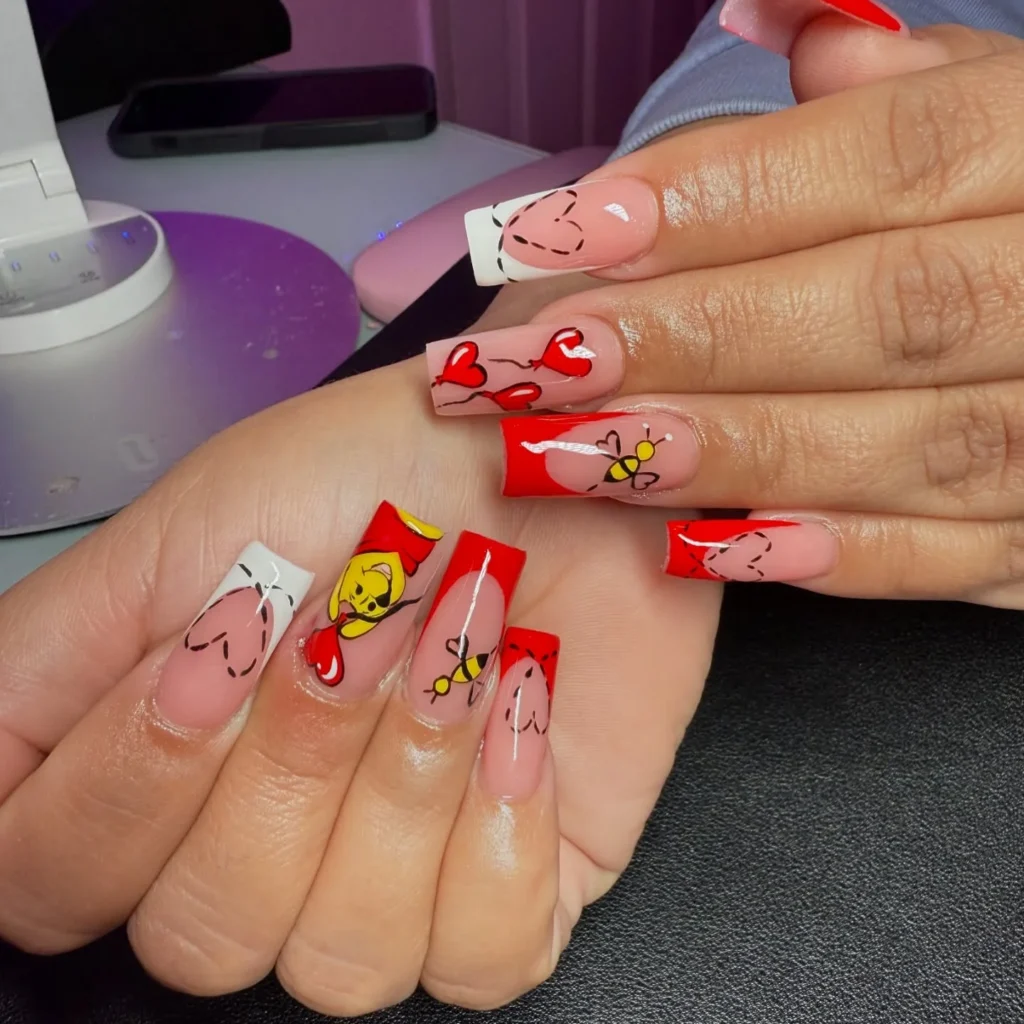 Red and white French tips meet playful illustrations of Winnie the Pooh and love-themed hearts, accented with buzzing bees. This design blends fun characters with a romantic touch.