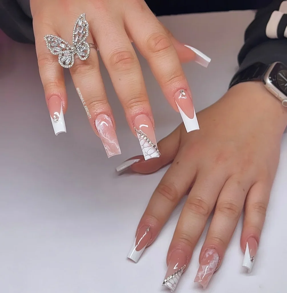 Chic square acrylic nails feature a delicate pink base, combined with sleek white tips, intricate marble detailing, and crystal embellishments. A sophisticated design perfect for any occasion.